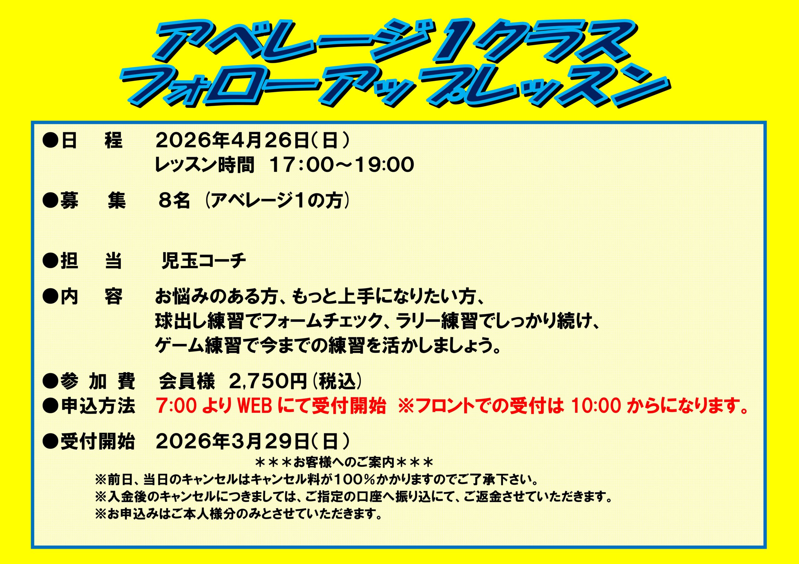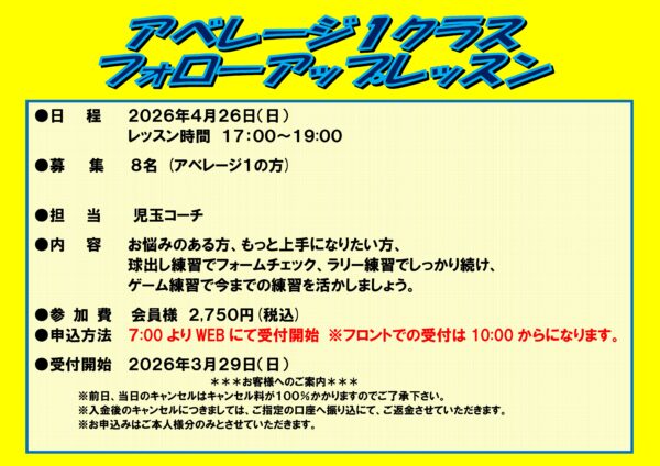4月26日(日)アベレージ1クラスフォローアップレッスン(コーチ変更のお知らせ)