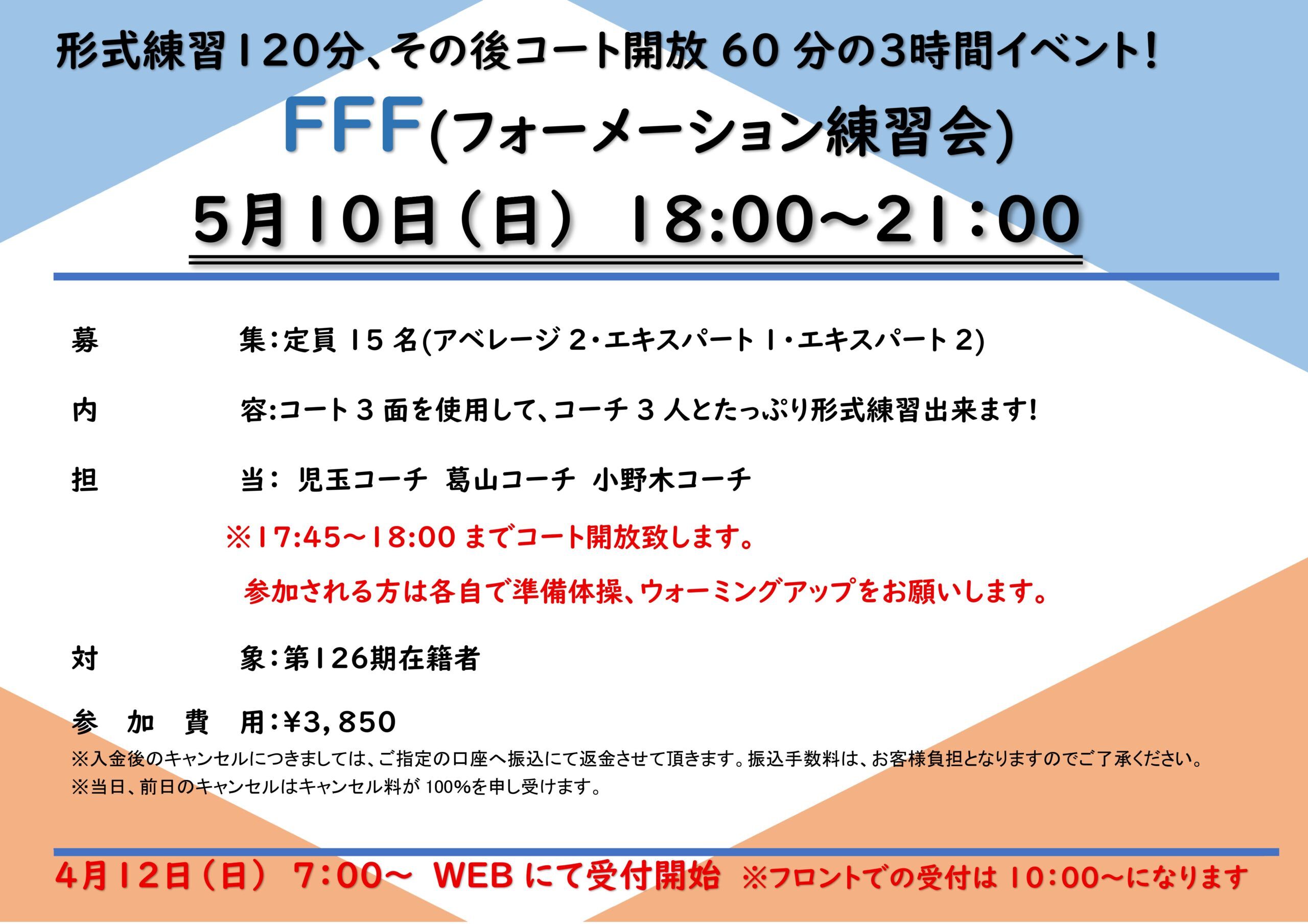 イベント&新着情報 5月10日(日)FFF(フォーメーション練習会) 2026年04月03日 « 4月26日(日)アベレージ1クラスフォローアップレッスン(コーチ変更のお知らせ) 5月17日(日)ミックスダブルス »